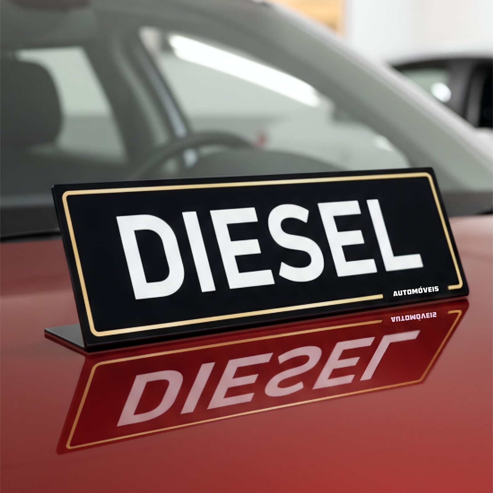 O acabamento em “piano black” reflete a luz do stand, garantindo que a informação principal (Diesel, Elétrico, Híbrido, etc.) se destaque de forma elegante sobre o capô ou tejadilho.